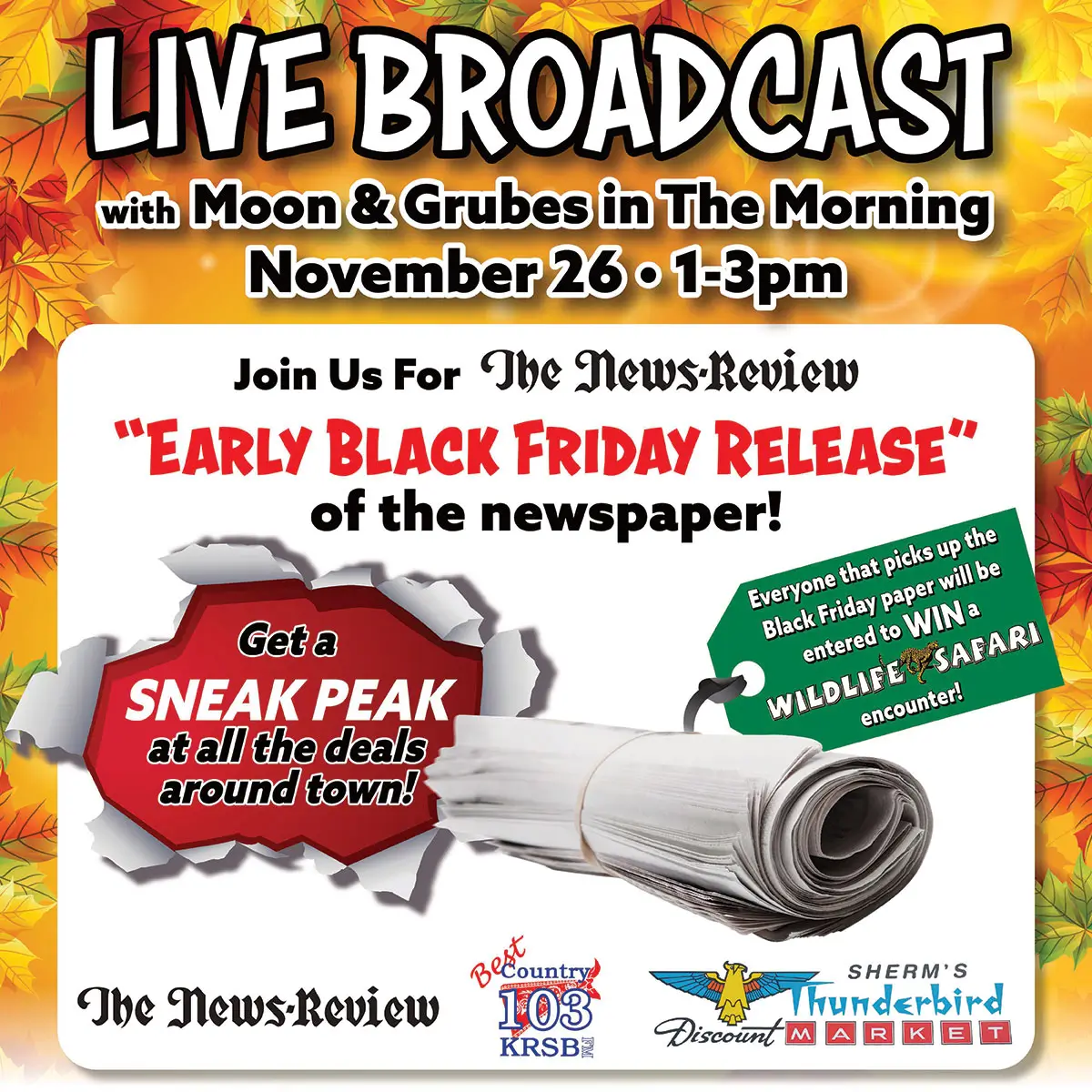 Moon & Grubes of Best Country 103 are LIVE in town TODAY! 🦃 Happening this afternoon, Wednesday November 26th from 1–3 PM at Sherm’s Thunderbird Market —The News-Review's EARLY Black Friday newspaper drop is going down! Grab your paper while they last, get the very first look at all the hottest deals in town BEFORE Black Friday officially hits tomorrow, and EVERYONE who picks one up is entered to WIN a Wildlife Safari encounter! 🦒🦁 Come hang out, say hi to Moon & Grubes, and get ready to save big — we will be htere until 3 PM! 👋 #Roseburg #BlackFriday #MoonAndGrubes #WildlifeSafari #ShopLocal