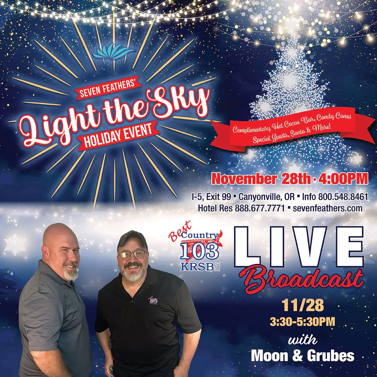 🌟 Moon & Grubes from Best Country 103 are wrapping up a wild Black Friday with a BIG finish! 🎄 Join us THIS FRIDAY, November 28th from 3:30–5:30 PM at Seven Feathers Casino Resort for the Light the Sky Holiday Event! The huge tree lighting happens at 4 PM sharp! ✨ FREE family-friendly fun ☕ Complimentary Hot Cocoa Bar 🍭 Candy canes for the kids 🎅 Santa & special guests 🎆 Extra dazzling Christmas lights & décor all season long! Come kick off the Christmas season with us—wear your favorite holiday gear and let’s make it a night to remember! See you there! ❤️💚 #SevenFeathersHoliday #LightTheSky #BestCountry103