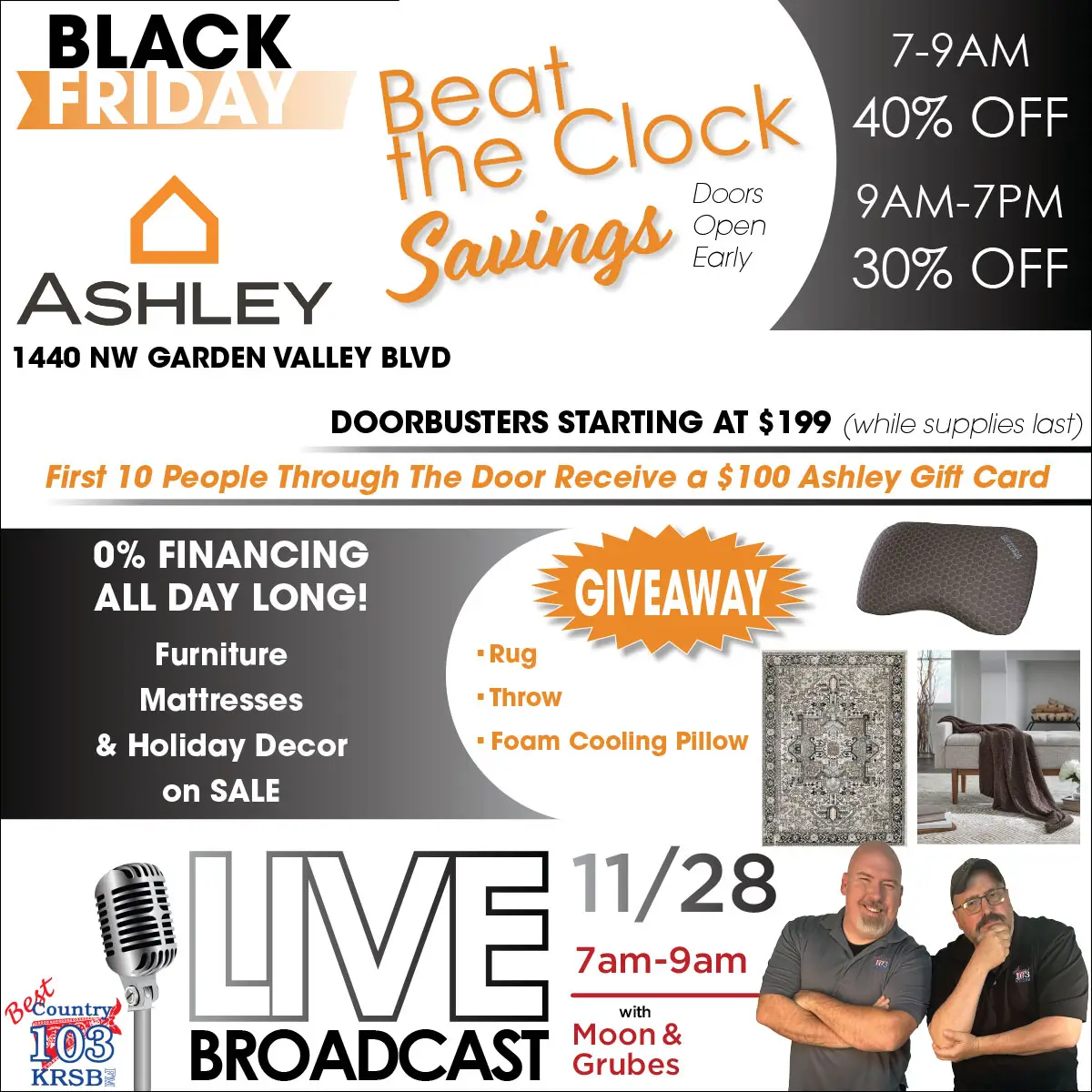 🚨 BLACK FRIDAY IS HERE at Ashley Furniture in Roseburg! 🚨 Get ready to SAVE BIG with our BEAT THE CLOCK event! ⏰💥 🎉 Doorbusters starting at just $199 (while supplies last!) 🎁 First 10 customers in the door get a FREE $100 Ashley Gift Card! 💸 0% INTEREST FINANCING ALL DAY LONG! 🕖 7AM - 9AM: 40% OFF STOREWIDE 🕘 9AM - 7PM: 30% OFF STOREWIDE PLUS... register to WIN an Ashley rug, throw blanket, or foam cooling pillow! 🏆 Join Moon & Grubes from Best Country 103 will be coming to you live from 7-9AM! Stop by their booth, say hi to the guys and Da'Roadie, and you might walk away with something extra! 🎤🎶 Doors open early — don’t miss the biggest savings of the year! See you Black Friday at Ashley Furniture! 🛋️🖤 #BlackFriday #AshleyFurniture #BeatTheClock #DFWDeals #FurnitureSale