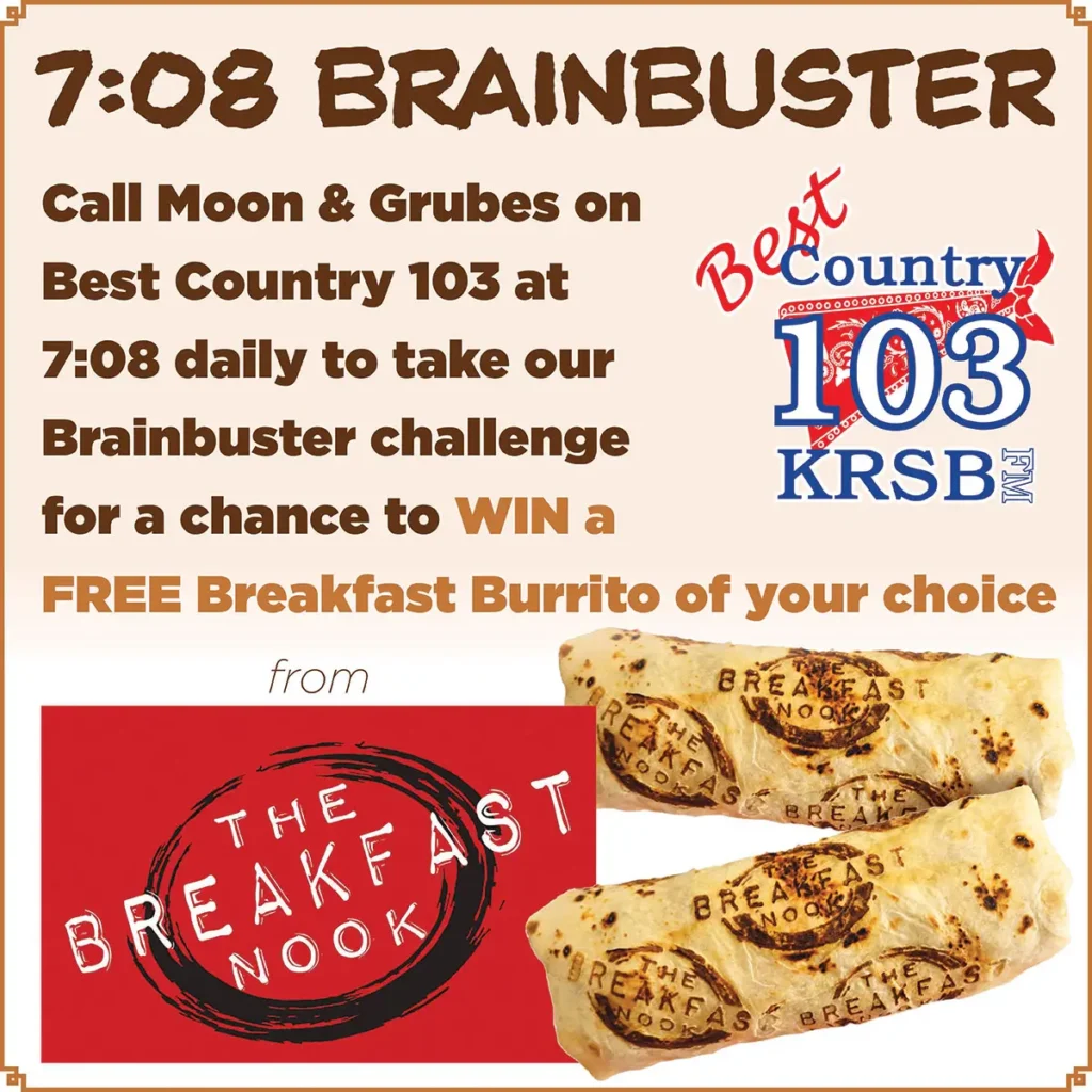7:08 Brainbuster7:08 Brainbuster Call Moon & Grubes on Best Country 103 at 7:08 daily to take our Brainbuster challenge for a…